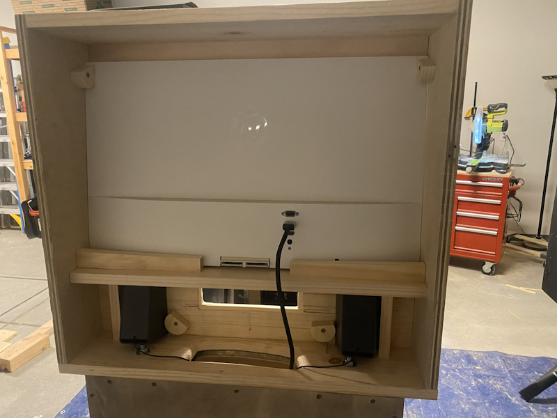 Inside, I built tracks to hold the speakers and backglass monitor.
