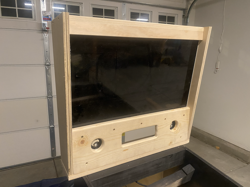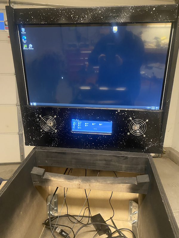 The glass finally came in! While I was waiting on that, I created a "frame" around the playfield monitor to cover up the gap between the screen and cabinet: