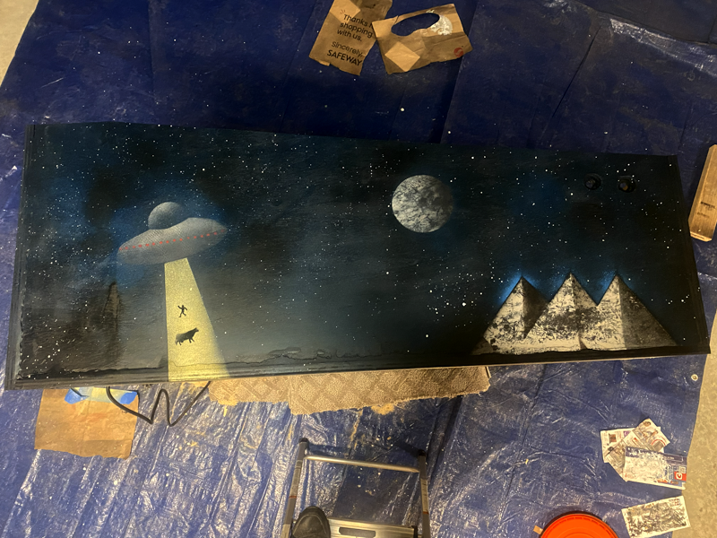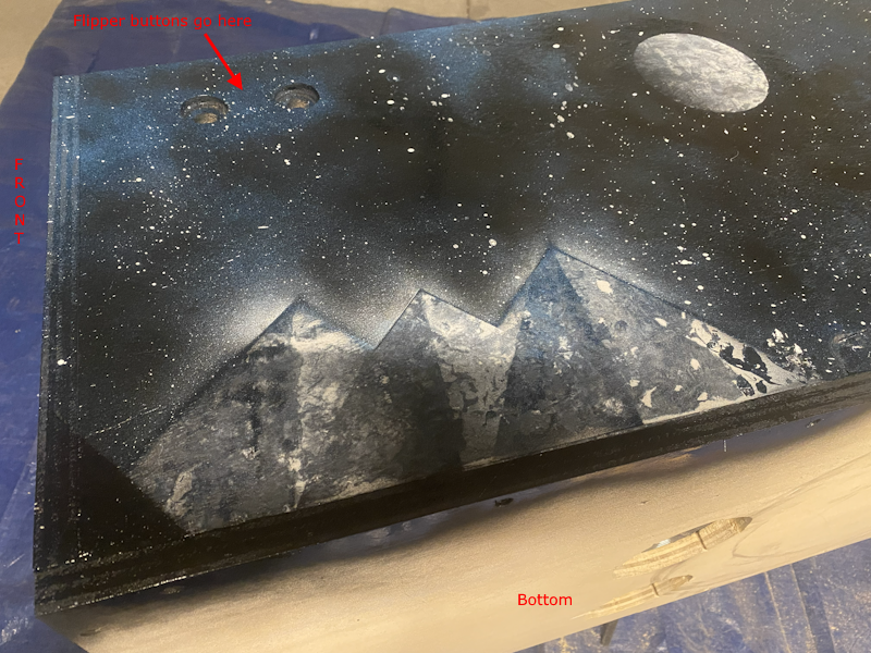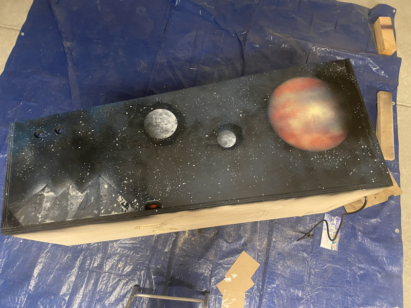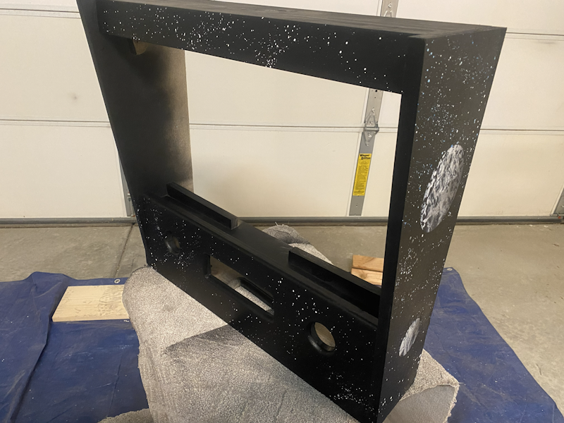 I started with just a light coat of black to start. Then, I painted a starfield and some moons to match the main cabinet: