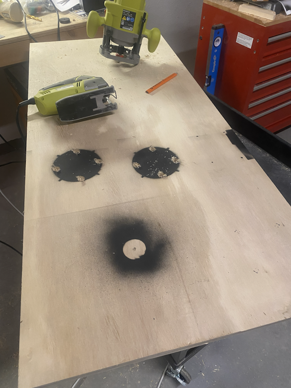 Next, I cut out the bottom piece and sprayed where the holes will go for the subwoofer and the air intake fan.