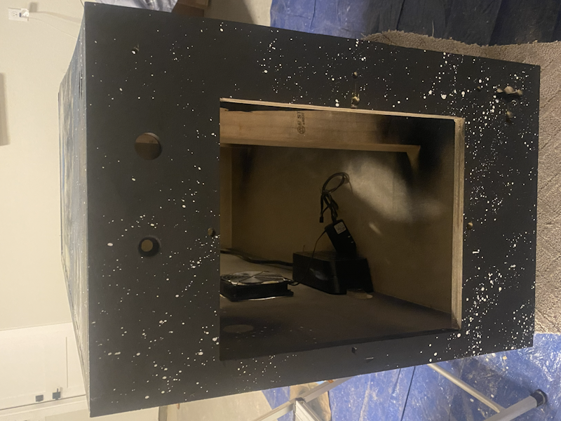 I started by painting the entire cabinet black. Then, I tipped it on its side and did a spacescape on one side.