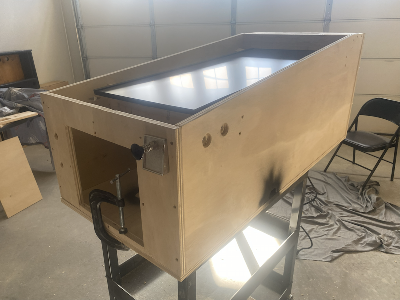 I cut a hole in the base to allow cables and air flow between the main cabinet and backglass portion. The backglass box is attached to the main cabinet with two large eye bolts (one on each side of the access hole).