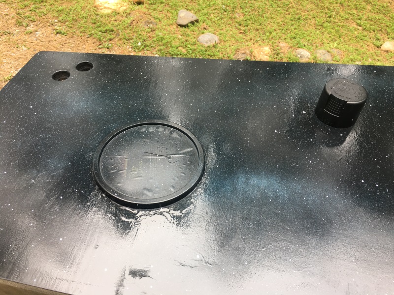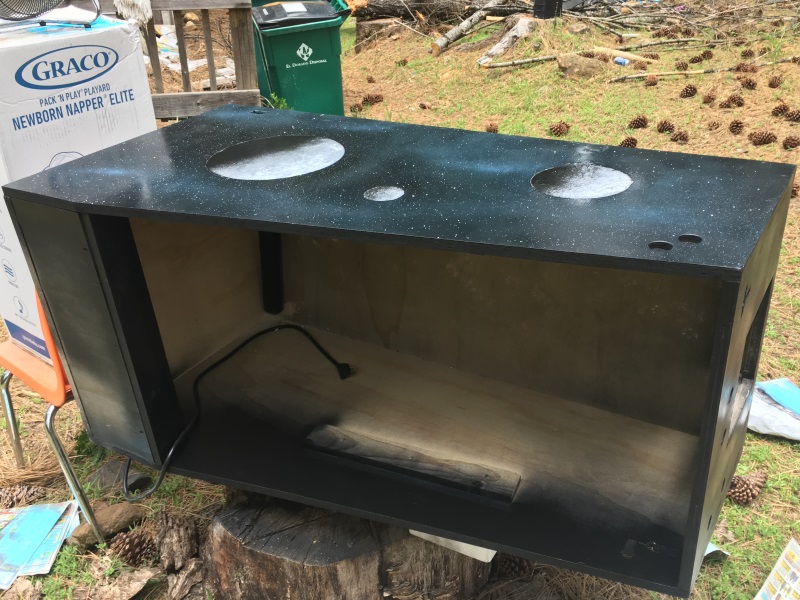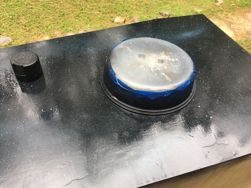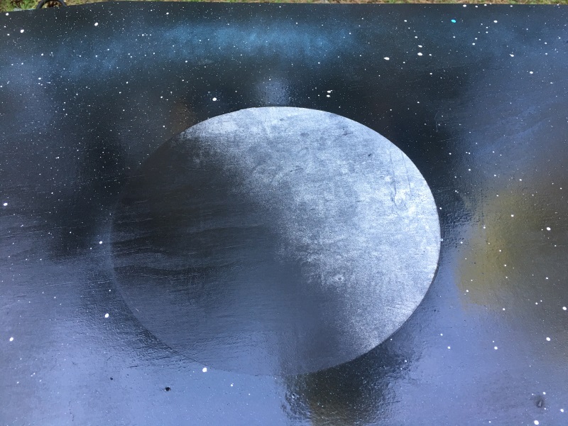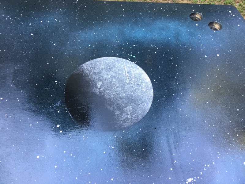 I picked up another can of black paint and finished the second side. You can watch the video linked above for how I made the planets with white spray paint and a crinkled up newspaper. Then, I placed the round objects on the planets and spray painted black around everything.