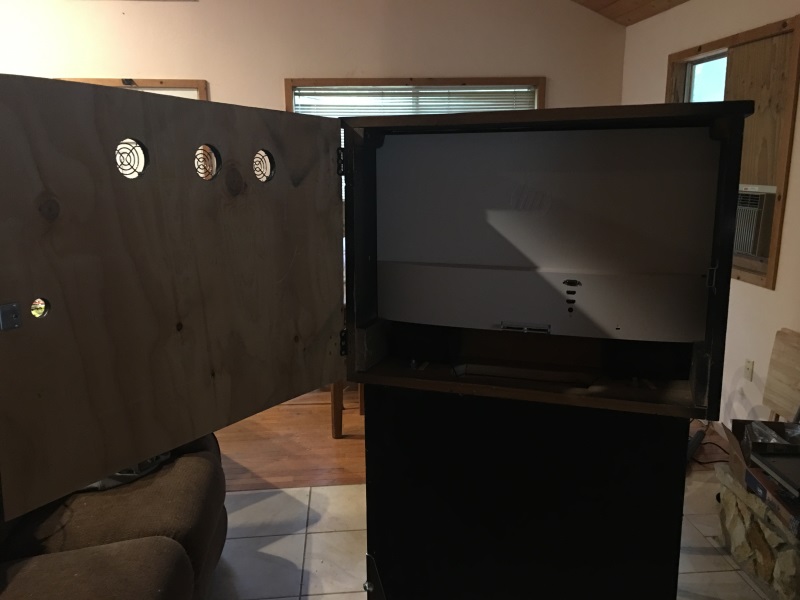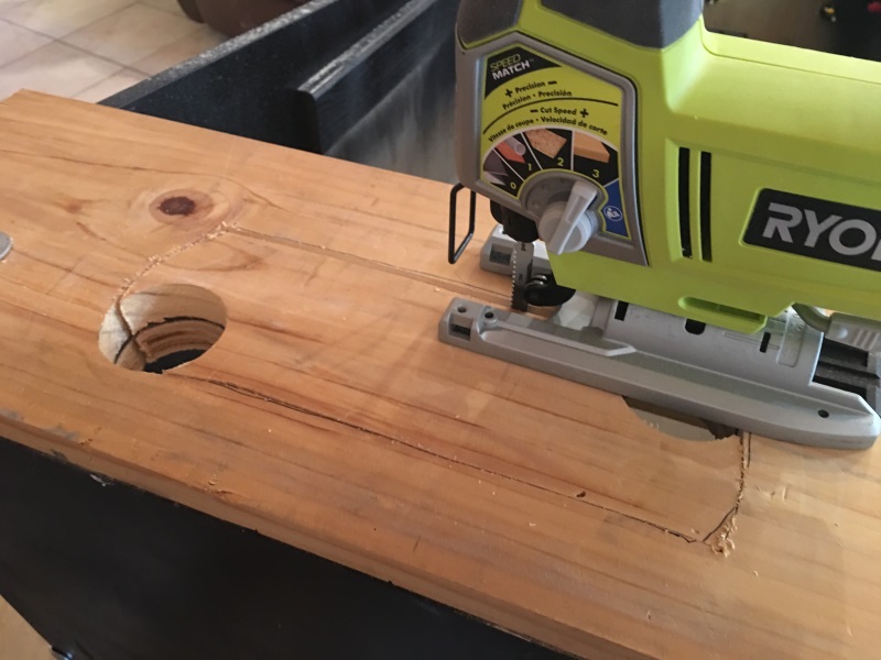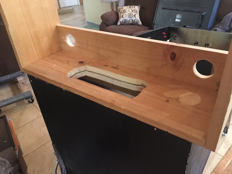 I used my jig saw to cut out a large hole between the backbox and cabinet. This hole will allow air to flow between the two spaces and also will serve as the way cords will get from the computer to the backglass monitor and to the speakers.