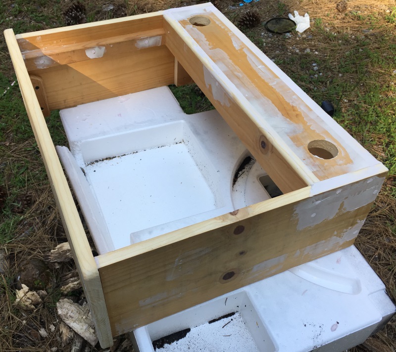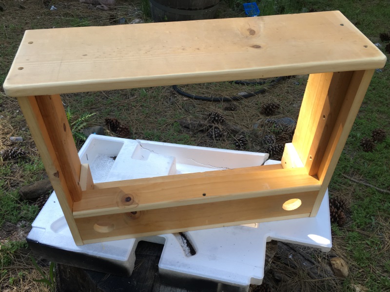 Next, I cut and attached a front panel (4 inches tall) and drilled two holes (2 inch diameter) for the speakers. Then, I cut and attached two side panels.
