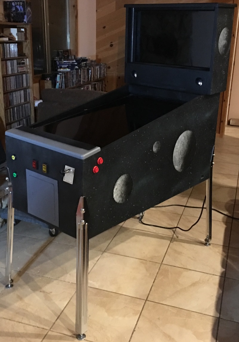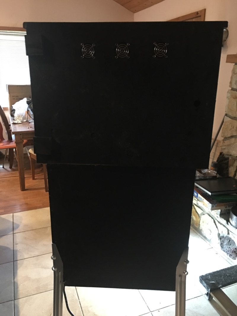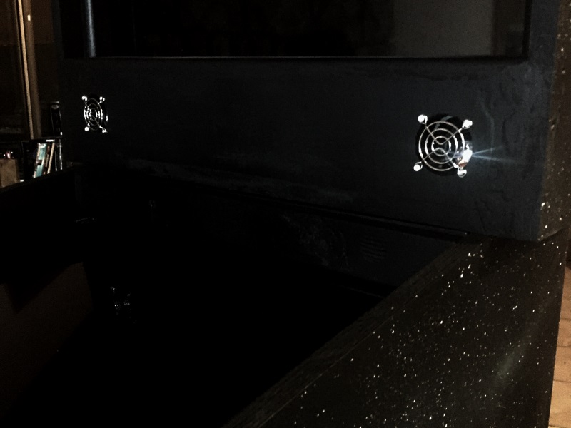 Once that dried, I sanded the whole thing nice and smooth and gave it 3 coats of black paint. Then, I added a star field on the sides to match the rest of the cabinet. Here's how it looks with the monitors and speakers in place.